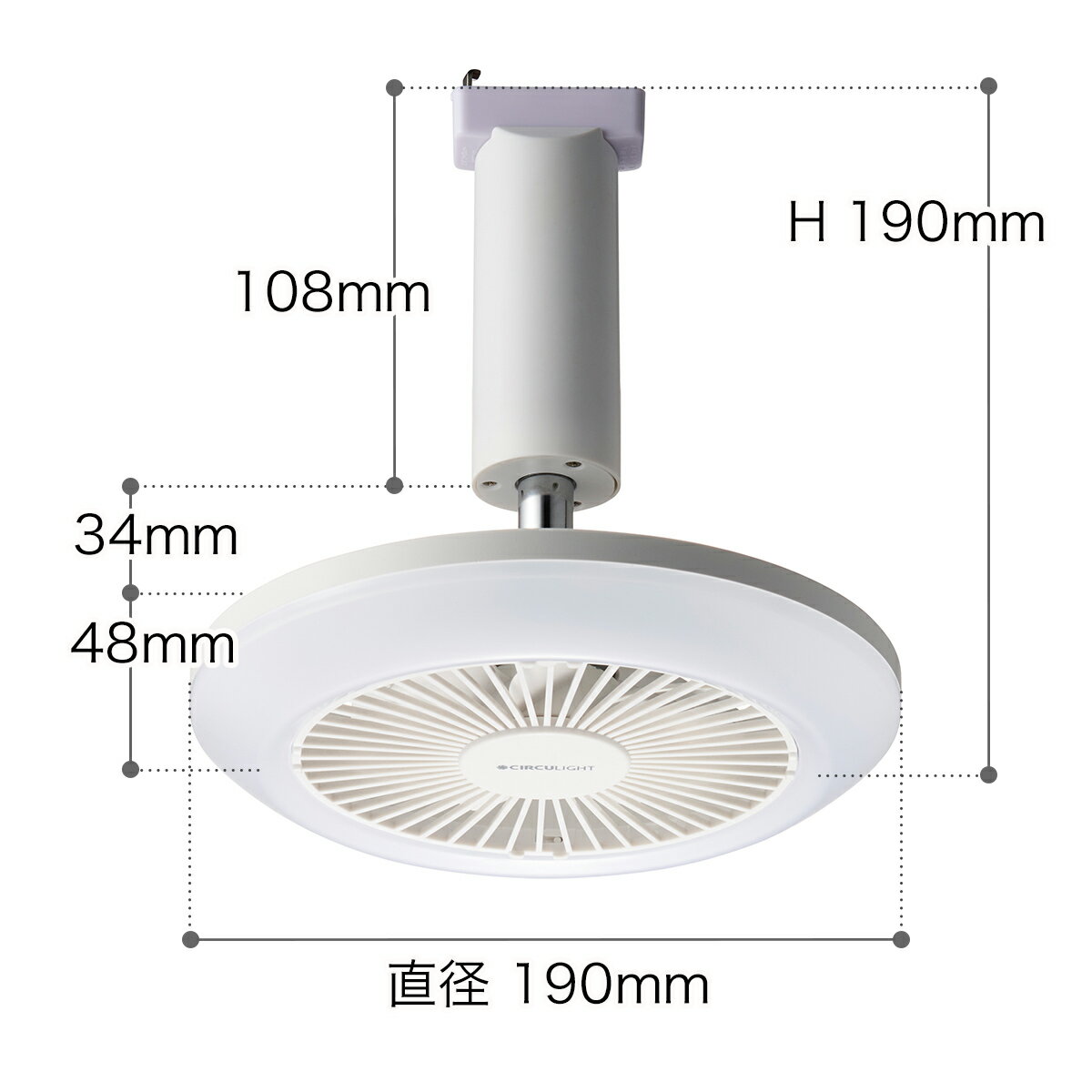 ファン+照明で快適に サイズ 約 直径 190mm×高さ 190mm( 引っかけ刃除く ) 重さ 約 400g 電源 AC100V 50/60Hz 消費電力 LED:約 9W( 強時 )ファン:約 4W( 最大風量時 ) 機能 ・調光:2段階( 弱、強 ) ・風量調節:3段階( 弱、中、強 ) ・角度調節:水平、垂直ともに約 300度 ・ファン切り忘れ防止機能( 12時間自動オフ ) ・前ガード取り外し可 光束 810lm( 強時 )※電球60W相当 推奨使用温度 5〜35度 リモコン使用可能範囲 本体リモコン受光部正面から直線で約 3m以内、左右に約 30度以内 保証期間 メーカー保証1年 付属品 リモコン、リモコン用電池( CR2025 )、リモコンケース、リモコンケース取り付け用ネジ×2、取扱説明書( 保証書含む ) 取り付け条件 ・天井に固定された配線器具で使用できます。