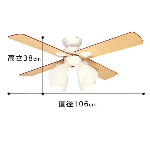 寸法 約直径106cm×高さ38cm 重量 約6.2kg 材質 スチール、ガラス、MDF 電源 100V 50/60Hz 電球の口金サイズ E26 定格消費電力 照明/60W モーター/38W 白熱電灯/240W(60W×4灯) 放電灯/52W(電球型蛍光灯ランプA型12/13W×4灯) 調光切替 2段階(2灯×2パターン、4灯) 回転速度 3段階(弱・中・強) 回転方向 正転/逆転 適用畳数(目安) 6畳〜8畳 付属品 リモコン、リモコンホルダー、取付金具 保証 1年 製造国 中国 備考 電球、リモコン用電池は付属していません。