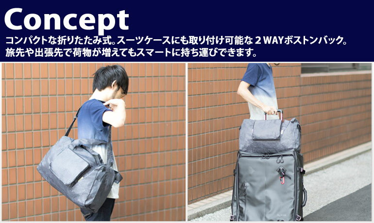 旅行や出張に便利で!スーツケースやキャリーケースのスライドハンドル(キャリーバー)に接続可能!使わないときはコンパクトに折りたためる便利でスマートなボストンバッグ(ショルダーベルト付き)です。